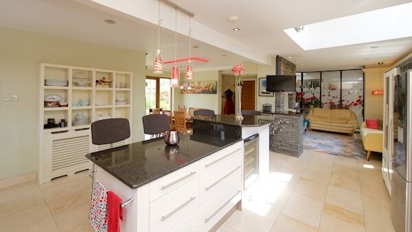 The main hall/linking spine is bright and airy, with a polished slate floor, and the extra deep window sills are in polished hardwood, while internal doors are hotel-style in walnut, whilst the original link to the back kitchen/dining /family room has quite recently had some internal walls replaced in glass, for an extra see-through bright delivery of family-friendly spaces.