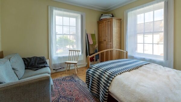 The first floor four bedrooms with timber flooring, high sash windows and cornicing, two at the front two at the back. The owners used the roof space above the kitchen, (a single storey later 19th Century addition), to create an en suite for a bedroom at the rear. Opening up the space they fitted large roof lights and a corner bath.