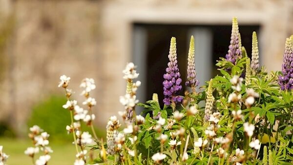 Outside the barn there’s a decking area, a log store and original cobblestone pathway leading to an extensive lawned garden enclosed by high stonewalls. Along the sides are colourful beds planted with cottage garden flowers such as sweet pea, wisteria, roses and strikingly tall purple lupins.