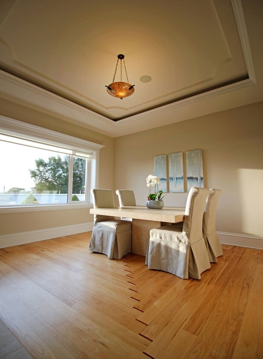The dining section overlooks the lake and has hickory flooring with cherry inlay.