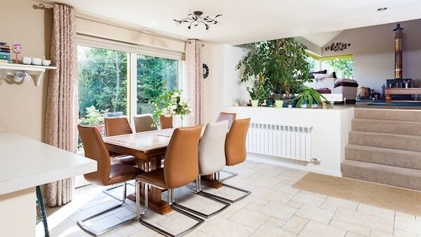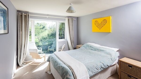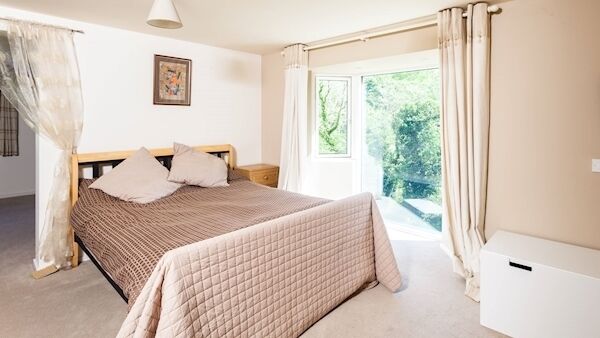 Layout-wise, itās quite open plan, yet not fully so, with a ground floor en suite bedroom at the far end, past a 28ā long kitchen/diner in the mid section. Thereās also a porch, utility and guest WC, and upstairs are two double bedrooms, with the master having a big bay window plus a large dressing room, main bathroom with tiled, step-up bath, and a separate hotpress. In all, about two-thirds of the overall floor area is at the lower/ground level, with a good range of large sliding doors for easy patio/terrace/garden access.