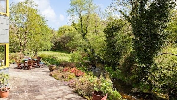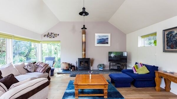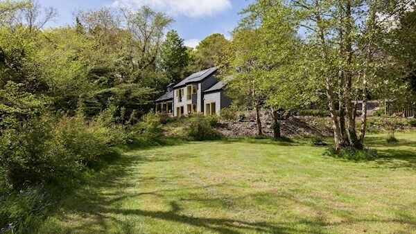 Built in a wooded setting on a screened acre, where a stream turns to a cascade after rain hitting the Caha Mountains to the north, between the main road and the sea at Millcove, Roaring Water was designed and built about 12 years ago by a West Cork woman who wanted to trade down from an adjacent, larger family home at Millcove, after her four adult children were reared and flown the nest.