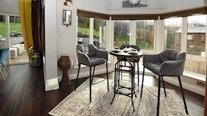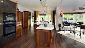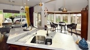 It links to a reconfigured kitchen/dining room, with several seating area options, depending on numbers to be accomodated, from a tall breakfast/coffee table for a small gatherings, to a more expansive seated dining area, overlooking the sweep of banked garden, patio and BBQ section, all capable internally of taking 10-20 diners and much used at Christmas time and family gatherings.