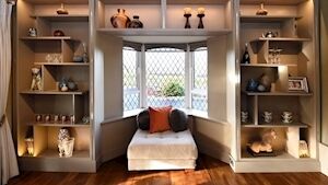 The owners did and redid No 14 to a very high level, both day one and subsequently, and sometimes drafted in the advice of interior designer Catherine Troy for a second opinion: they readily credit her with, for example, detailing the main living room’s feature display shelving, with offset shelves, hidden lighting for object display and for integrating thin strips of silver into some uprights to raise it all to just another level, with the cabinetry work done by Willow Design.