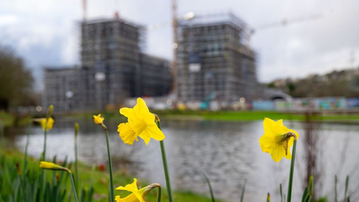 Spring greenery and daffodils in Marina Park in the foreground, with construction cranes and a major residential development rising in the background. The scene highlights the balance between expanding urban housing and the preservation of accessible public green space. Photo: Chani Anderson