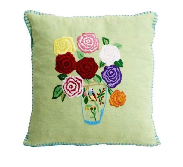 The home-made look is typified by hand-embroidered flowers on a vintage-style cushion (€59.95, at Pavilion Garden Centre).