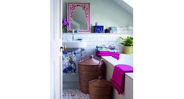His towel selection has moved away from gleaming white to versions saturated in indigo and cerise or patterned with motifs of blowsy florals and birds on branches.
