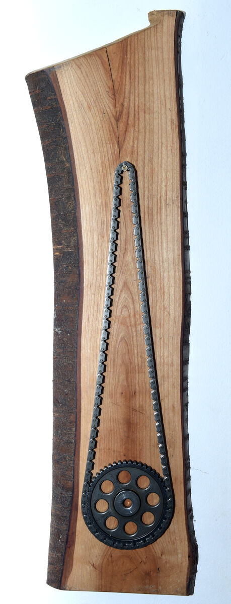 It seems a visit to the mechanic for car repairs yielded a metal timing belt, which Fergal mounted on a slice of waney edged European cherry wood and hung in the hallway.