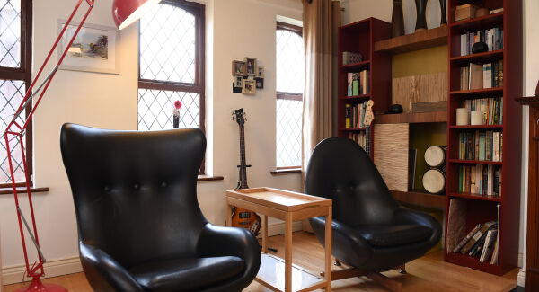 It’s definitely the conversation piece of the house, I think, until I drift into the living room and my eyes come out on stilts at the sight of two black vintage swivel chairs. There’s something of Arne Jacobsen’s Egg chair about them, but not quite.
