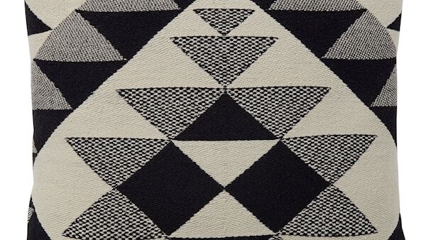 The monochrome and often stark black and white combination is softened by grey accents and a mix of angles and curves in the pattern of the Kilim cushion (€22)