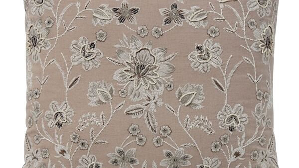 For a traditional look, the Ornamental cushion with embroidering detailing is finished in taupe and cream against a vintage style faded pink background (€32).