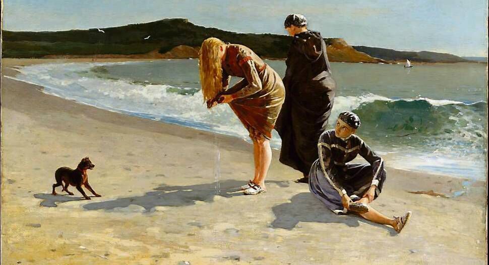 âI felt his work was so appropriate to what we were trying to create. In fact, that unusual floppy hat that Jo wears on the beach is an ode to Winslow Homerâs High Tide.â Following his experience as an illustrator during the American Civil War, Homer turned his attention to lighter scenes of contemporary life, often focusing on fashionable young women. This painting of three bathers on a Massachusetts beach was his most daring subject to date.