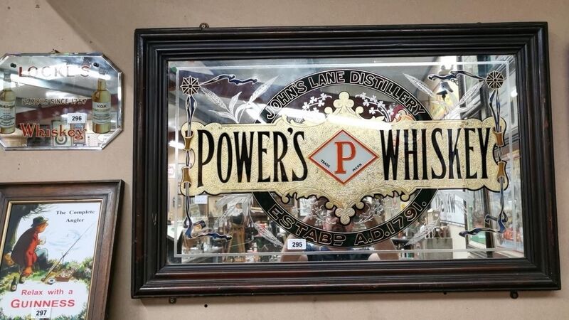 A rare Power's Whiskey gilded advertising mirror in its original frame at Victor Mee's auction.