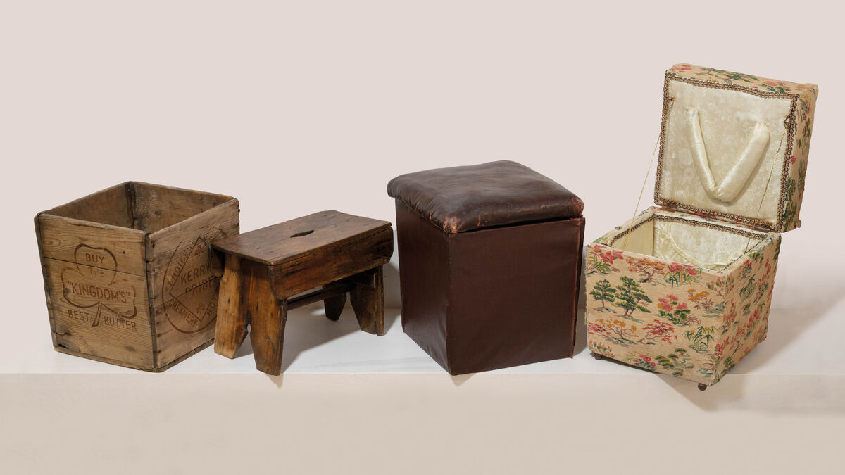 Pine butter boxes in original form for packing 56lbs of butter, then recycled into a stool, an upholstered seat, and a sewing box/seat. Picture: The Butter Museum, Cork