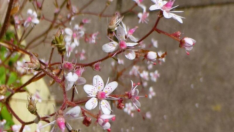 St Patrick's Cabbage, saxifrage spatularis, a Lusitanian species not present in Britain but cultivated in gardens there and called London Pride. Enjoyed by pollinators, as seen here.