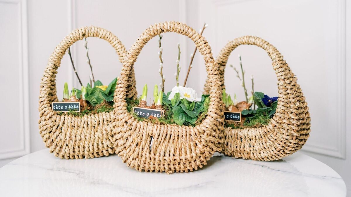 Vintage-style baskets filled with a variety of blooms and greenery make a lovely special occasion gift.