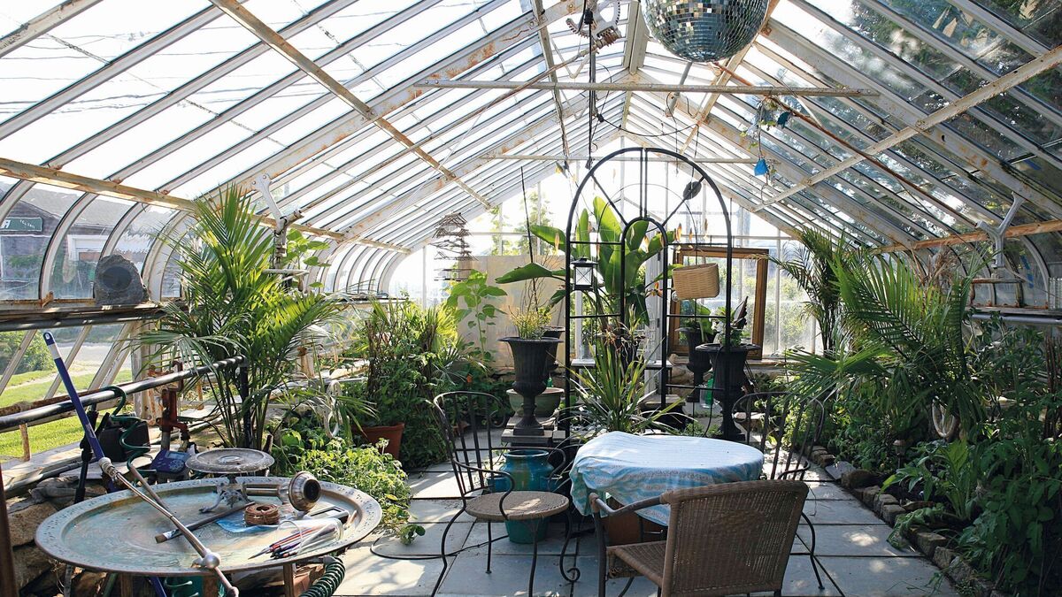 A 100-year-old glasshouse owned by Brenda in Massachusetts, USA, is made from cypress and metal and filled with second-hand furniture to make a relaxing space lit only by candles.