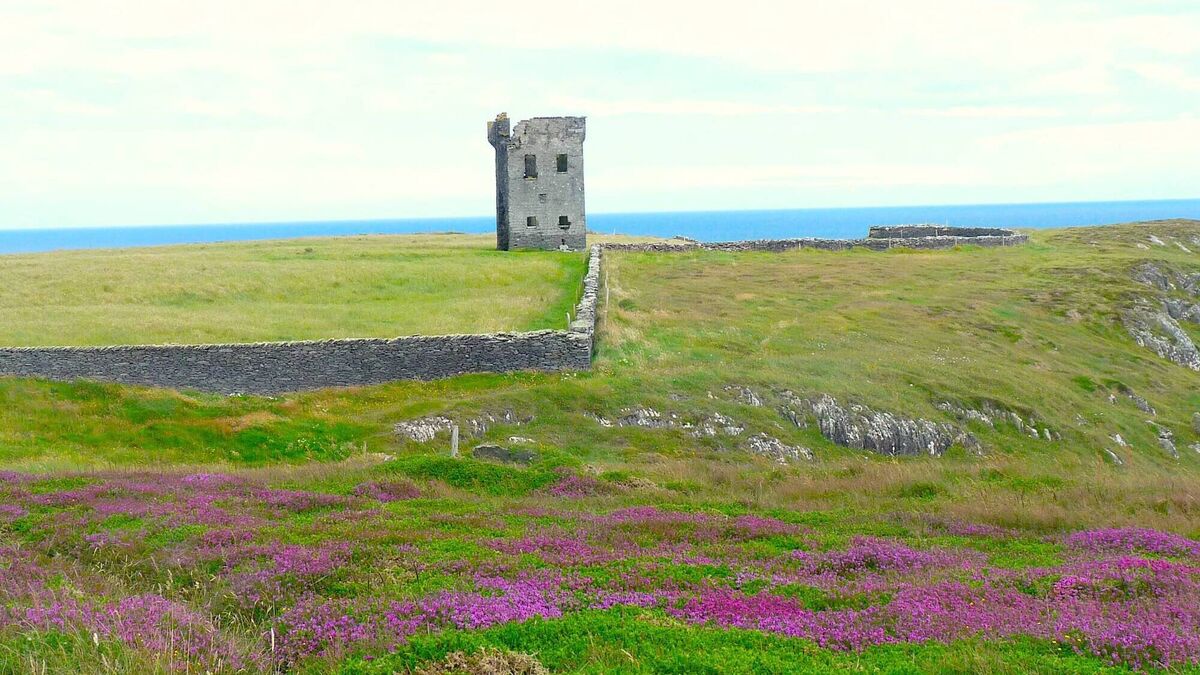 Heather starting to flower on Seven Heads, West Cork, with ruined tower, built 1804-1806 as a lookout for the threat of the Napoleonic fleet arriving to invade Ireland.