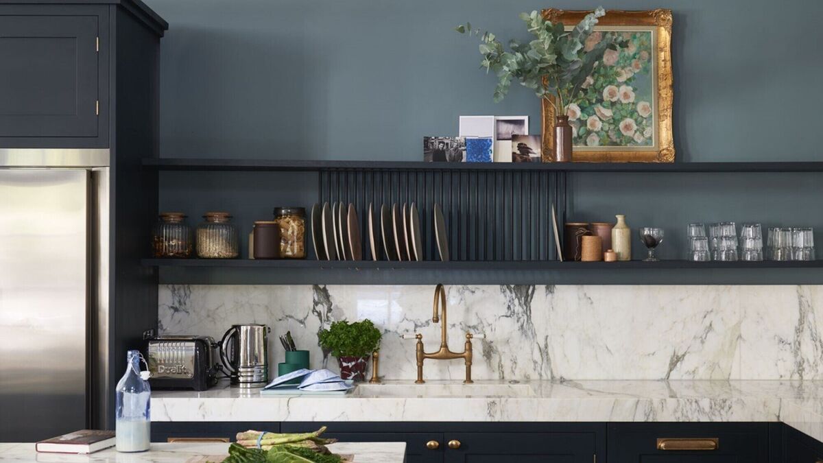 Adding a simple shelf over the sink delivers a spot for stacking baskets, boxes, jars, cooking books and even a place for your tablet to sing out recipes. Image: Farrow & Ball
