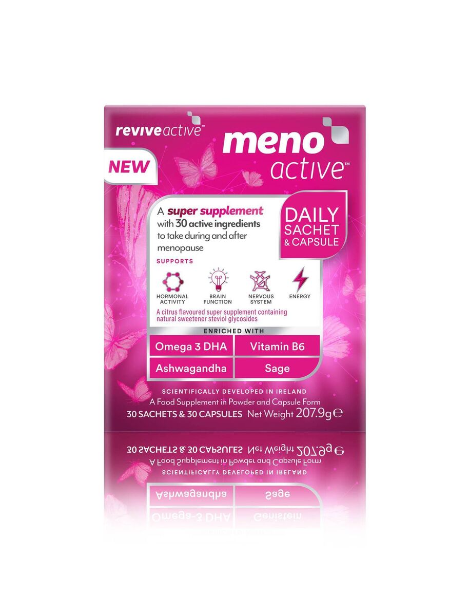 Meno Active is a super supplement containing 30 active ingredients including vitamins and minerals, digestive enzymes, live friendly bacteria, Omega 3 DHA and plant extracts to take during and after menopause. Â
