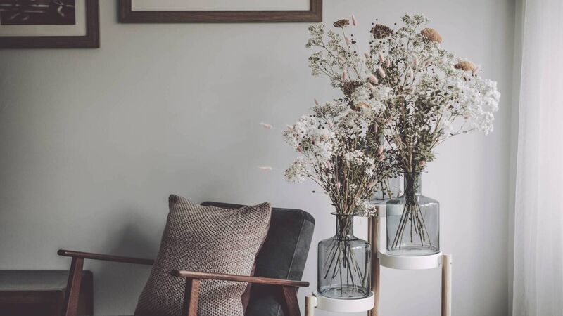 A few discreet silk carnations sit with in a highly modern arrangement that blends in with a neutral setting. The Bauhaus stands and vases are deliver a tall sculptural eye-catcher Picture: iStock