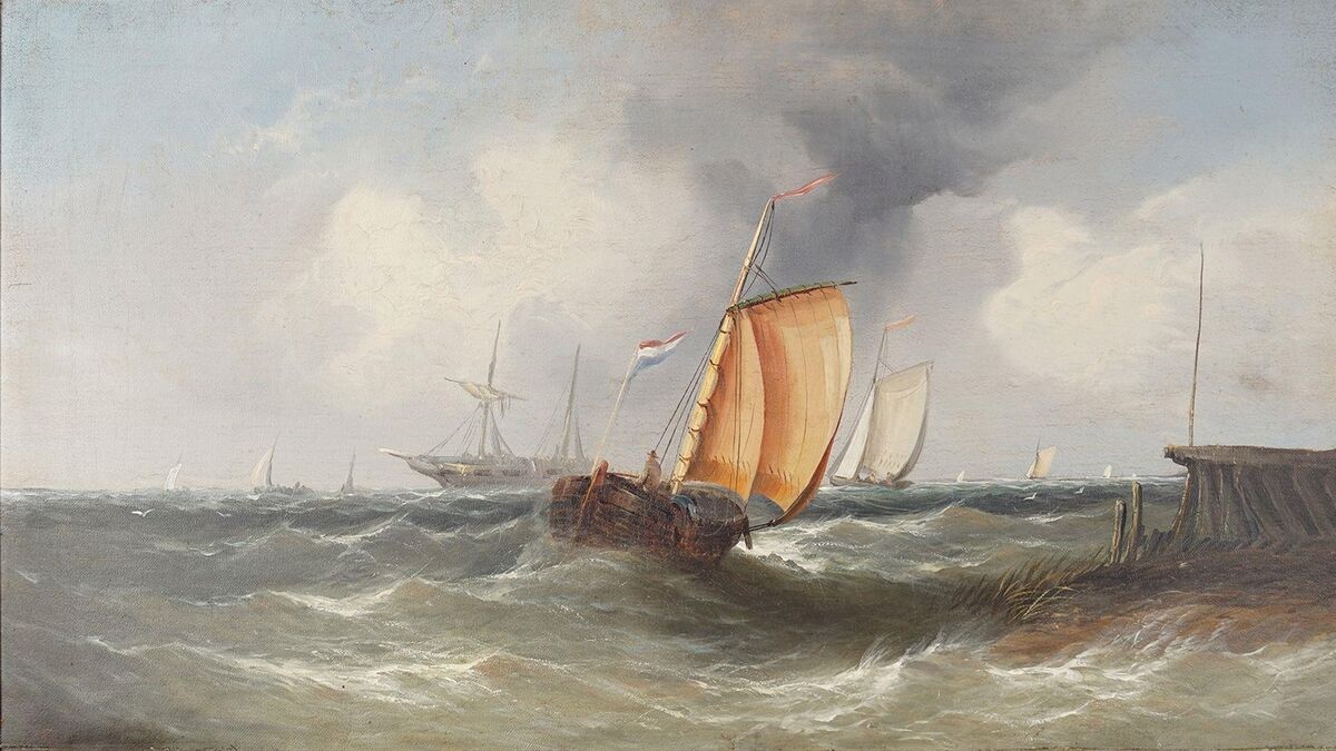 One of a pair of large seascapes of Dutch sailing vessels on rough seas by George Mounsey Wheatley Atkinson (1806-1888).