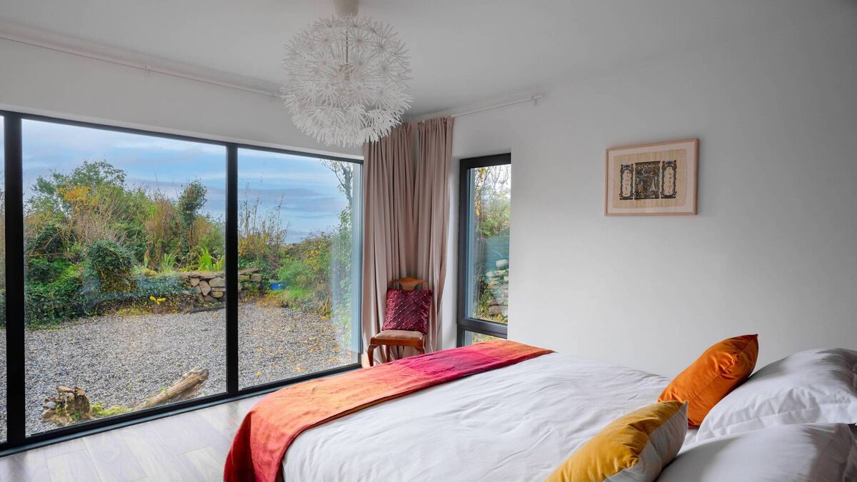 The first-floor shows how the ceiling follows curve of the barnstyle roof, and the glazing takes full advantage of the Atlantic views.