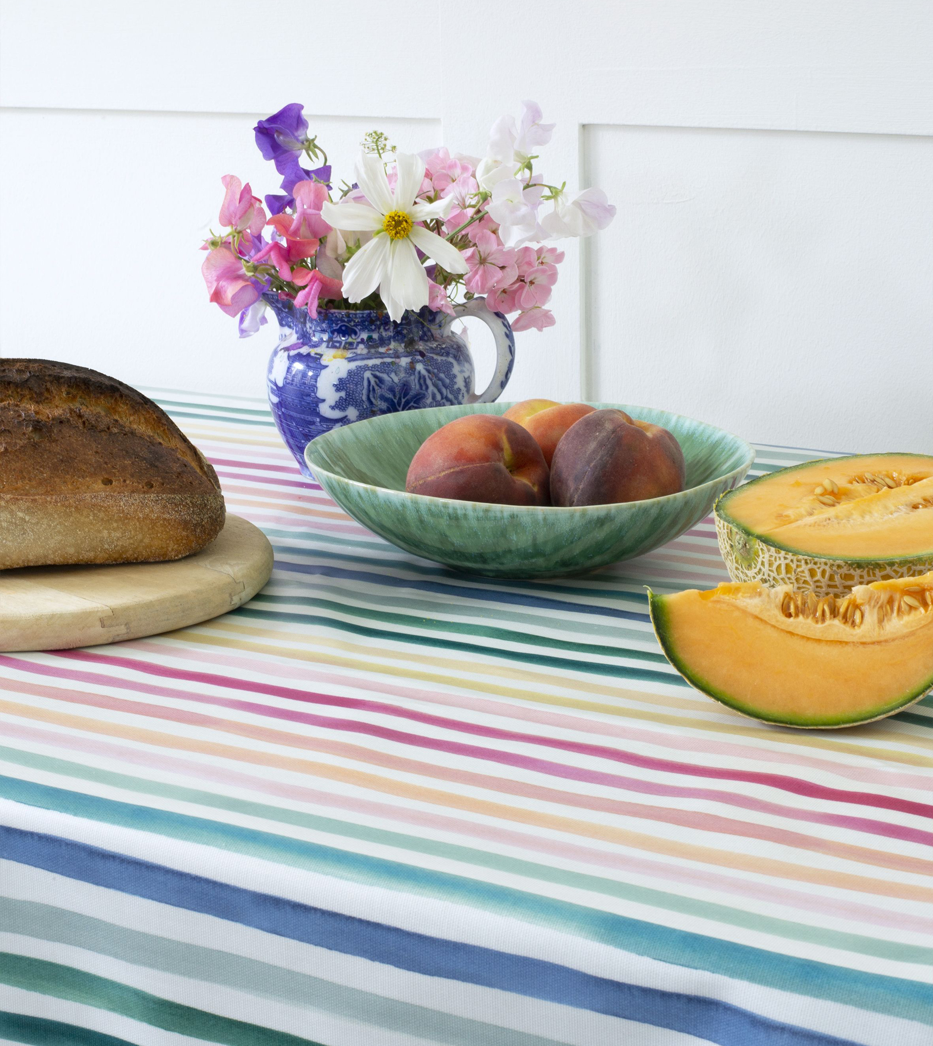 Bold stripes have that knack of making everything look bang up to date, especially in chunky stoneware, teamed with colourful glassware, striped placemats and trendy squiggles.