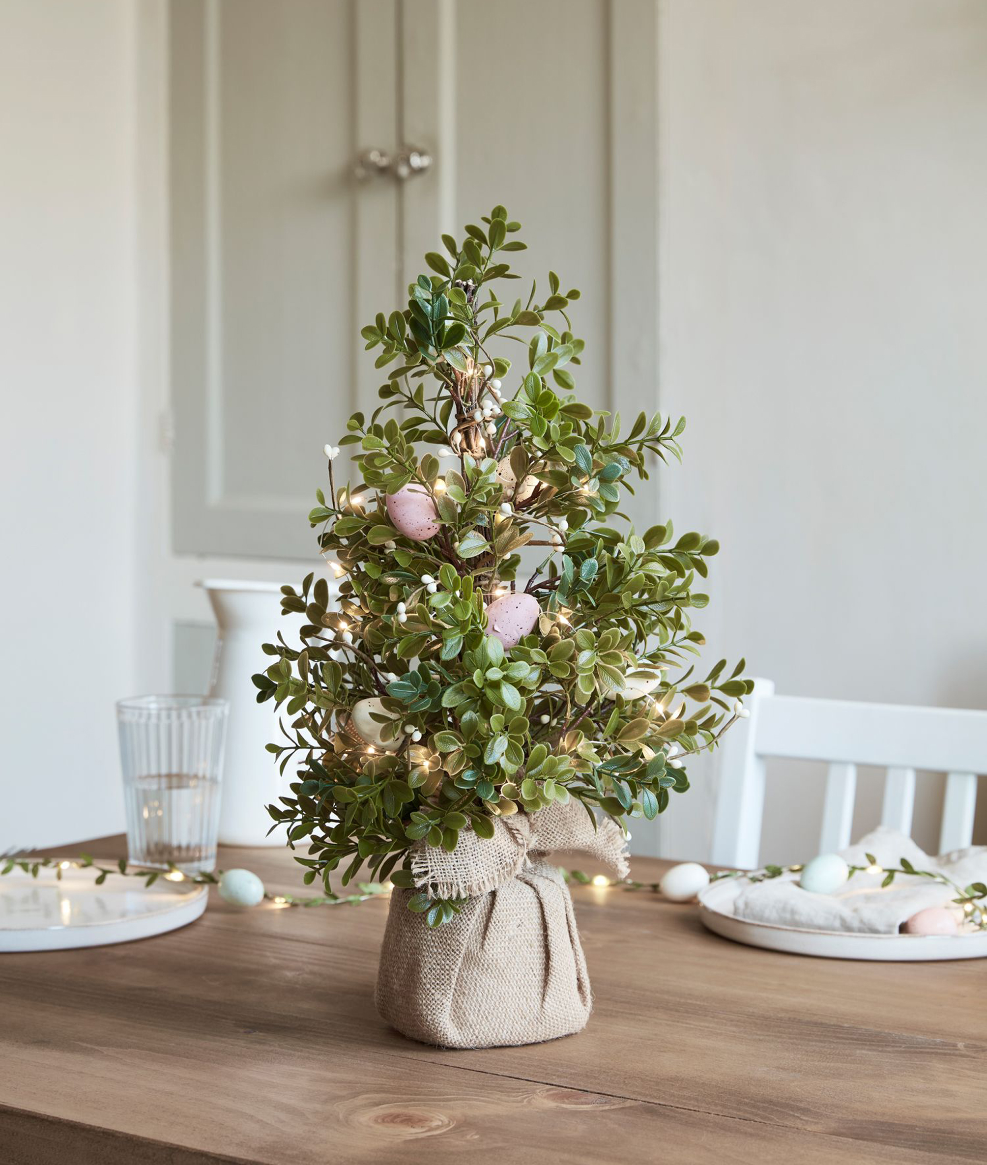 Along with mini trees and centrepieces crowned with votives, a clever trick is to hang Easter decorations on twigs and branches. Allowing for space, Easter wreaths can always be placed flat in the centre of the table with a pillar candle in the middle for extra impact.
