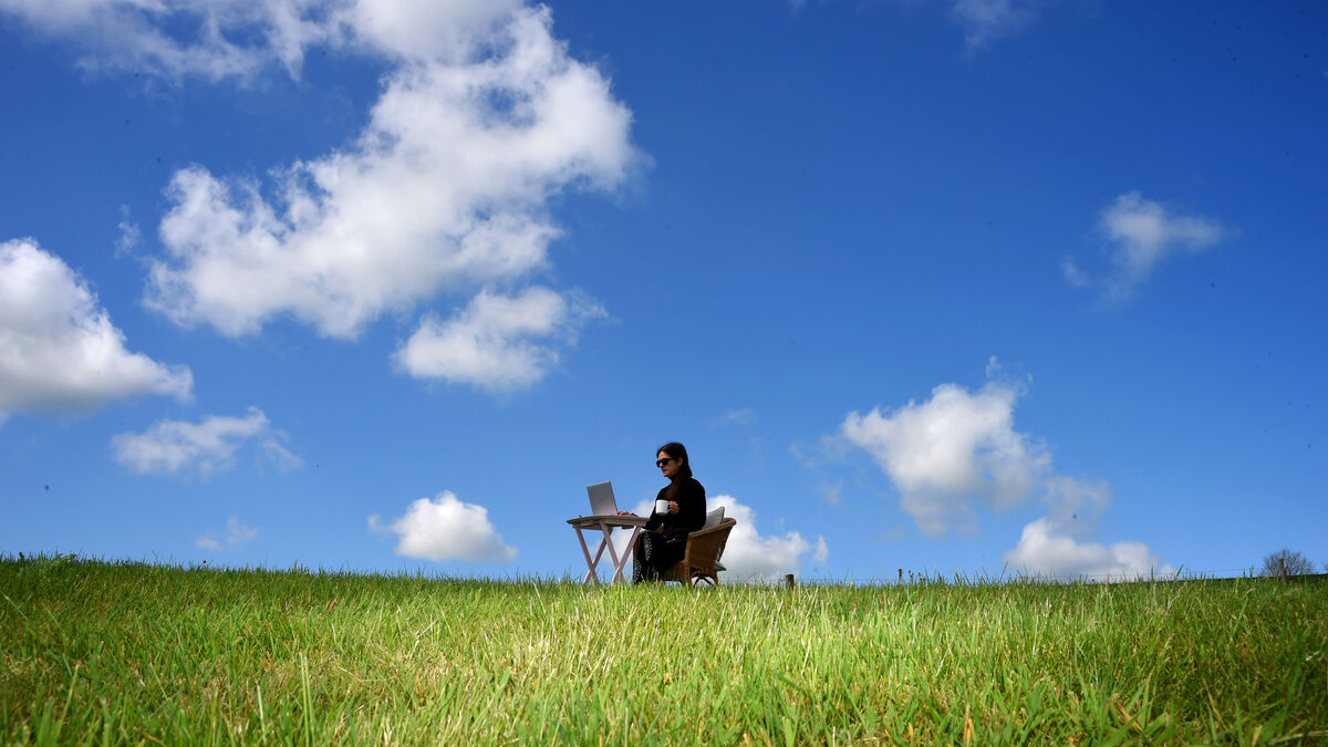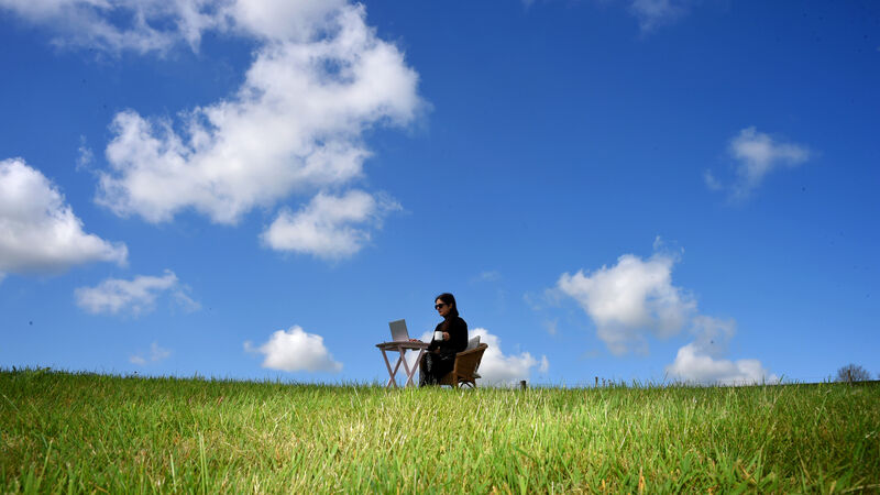 Carol O'Callaghan working remotely outdoors on her upcycled table on a sunsoaked day. Pictures and Video: Larry Cummins