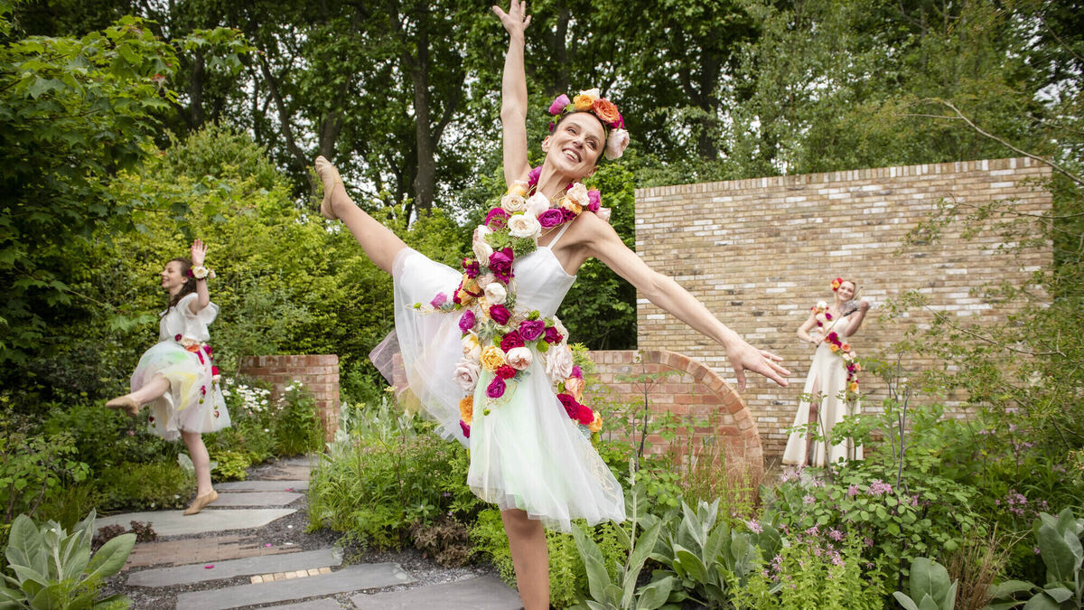 Professional dance duo Kate Garvie and her daughter Ruby Garvie, age 13, with violinist Sally Potterton, perform at the Brewin Dolphin garden designed by Paul Hervey-Brookes at RHS Chelsea Flower Show.