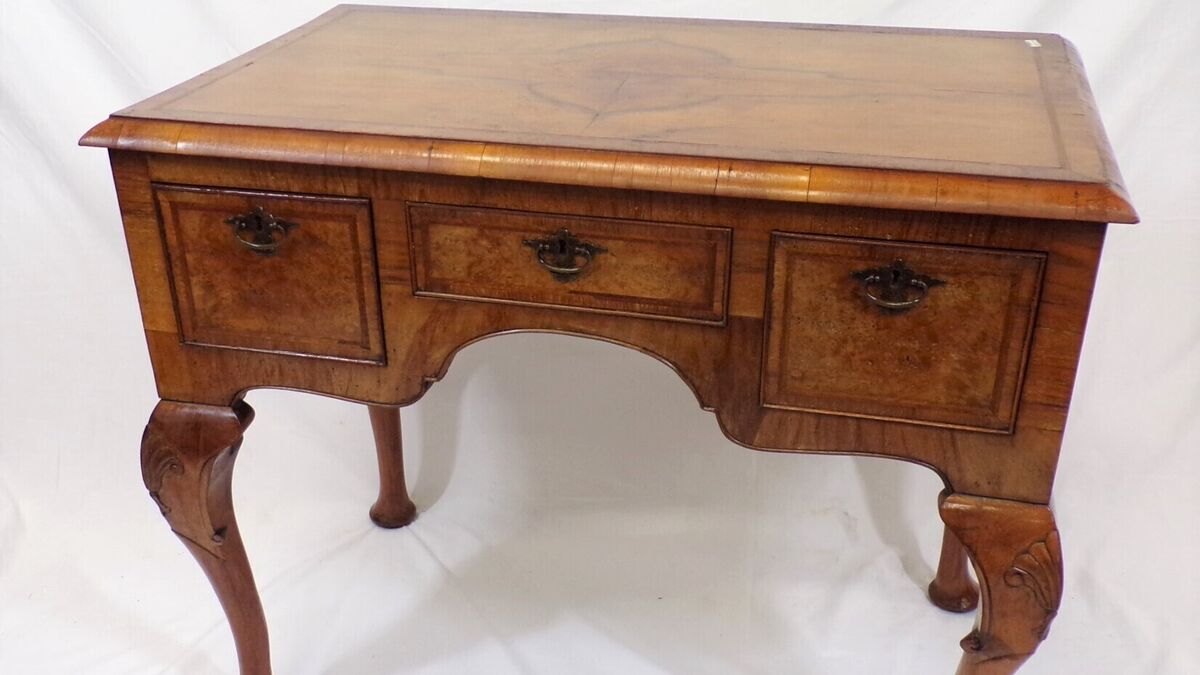 This Georgian walnut and mahogany inlaid lowboy is at Woodwards in Cork today.