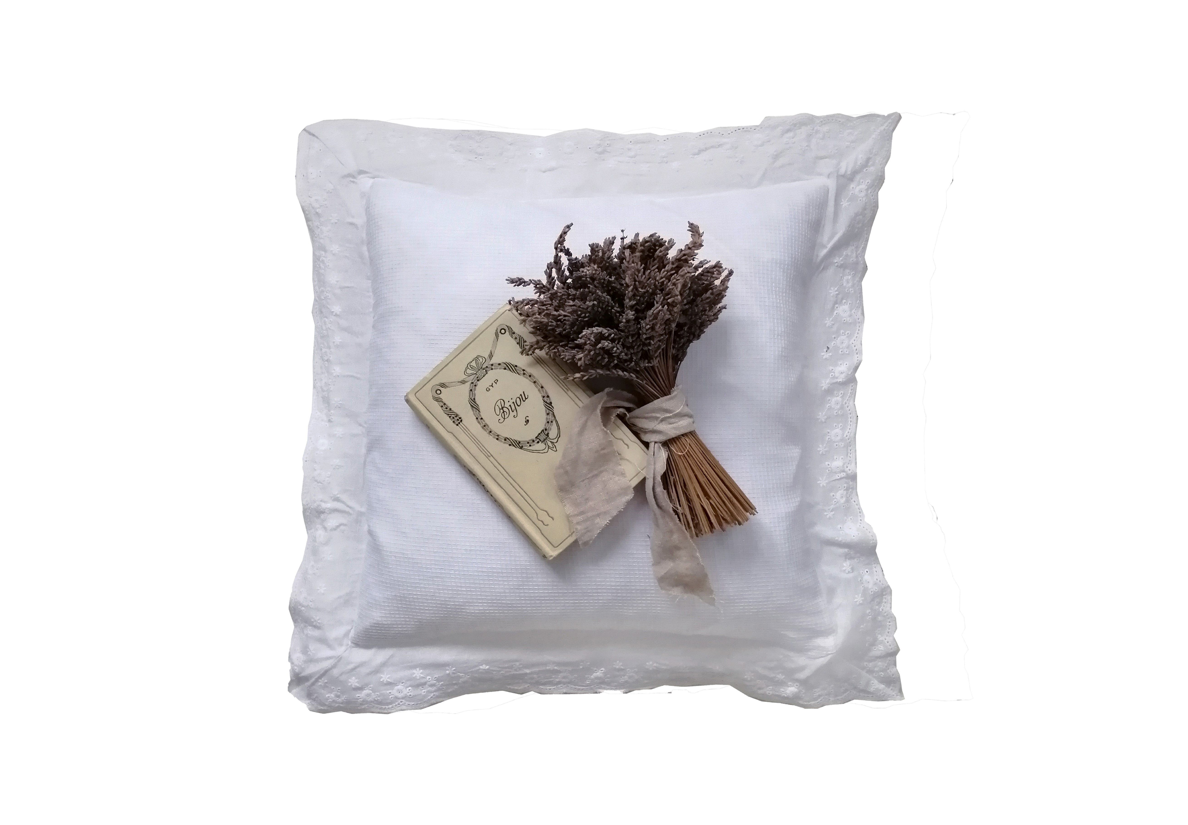 If you’re reimagining a bedroom with romantic lace curtains and vintage white bedding, this decorative cushion with waffle design and broderie anglaise border looks whimsy and welcoming.