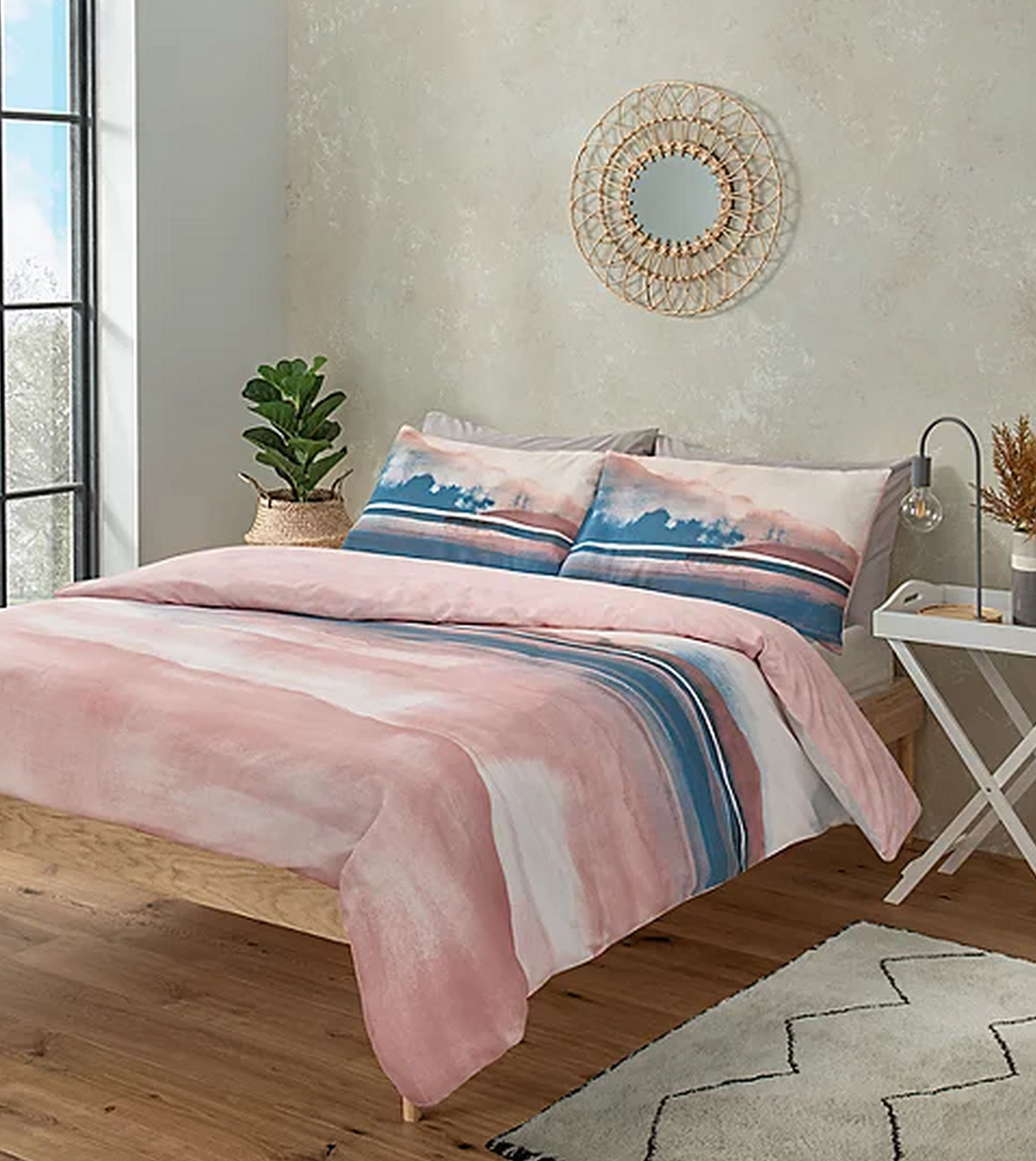 Think magical sunset and pink hues merging with pacific blues… This sense of peace can be recreated with this mesmeric bed linen.