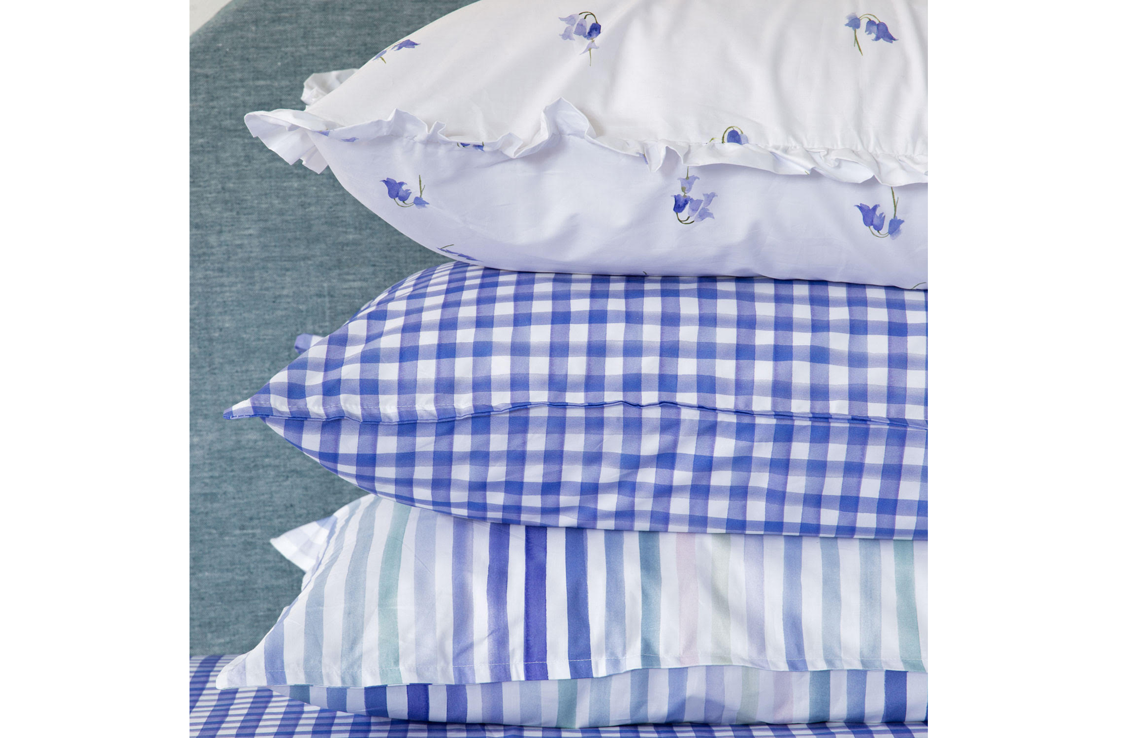 7. Bella Frilly Pillowcase (top); Gingham Plain Pillowcase (middle), and Gaaee Cornflower Plain Pillowcase (bottom), Bluebell Gray