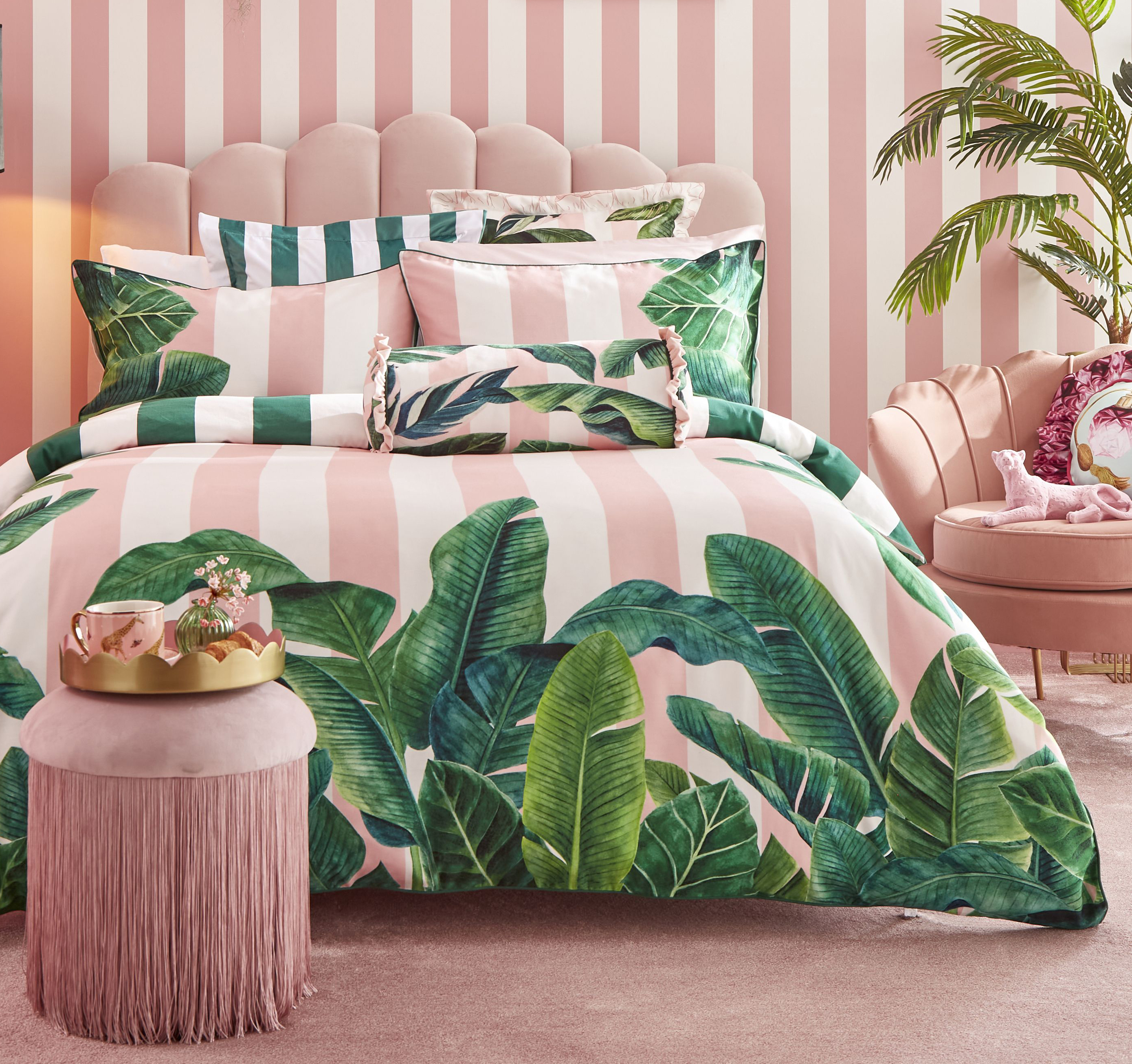 If tinsel town is your dream destination and a suite in the Beverly Hills Hotel furnished in candy-stripe pink is totally your show, this lavish bedding set offers a taste of the high life.