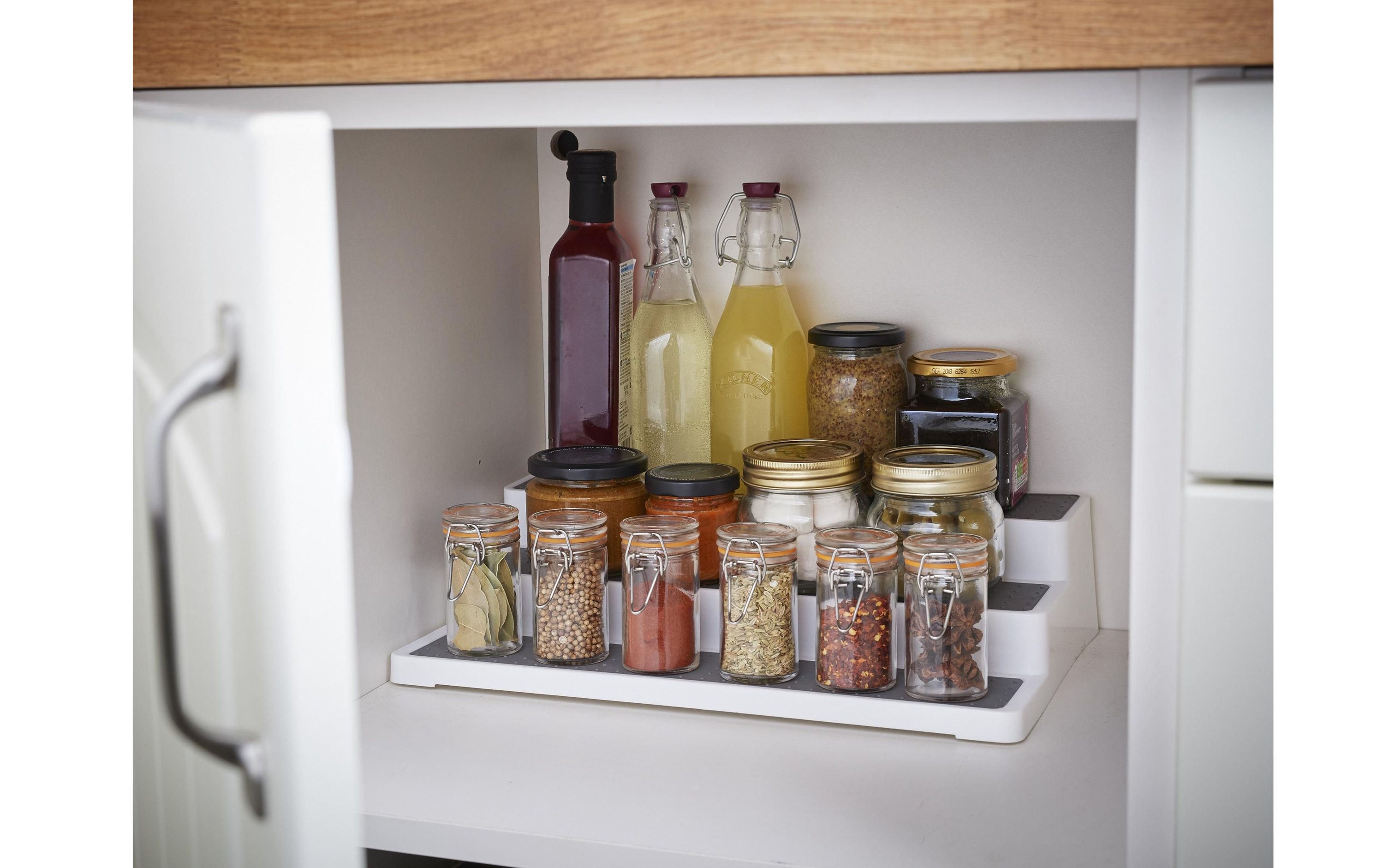 Her top tip in the kitchen is to store all like items together. So, all pastas, rice and carbs together. Or treats â crisps, for example â categorise those together and then contain them.