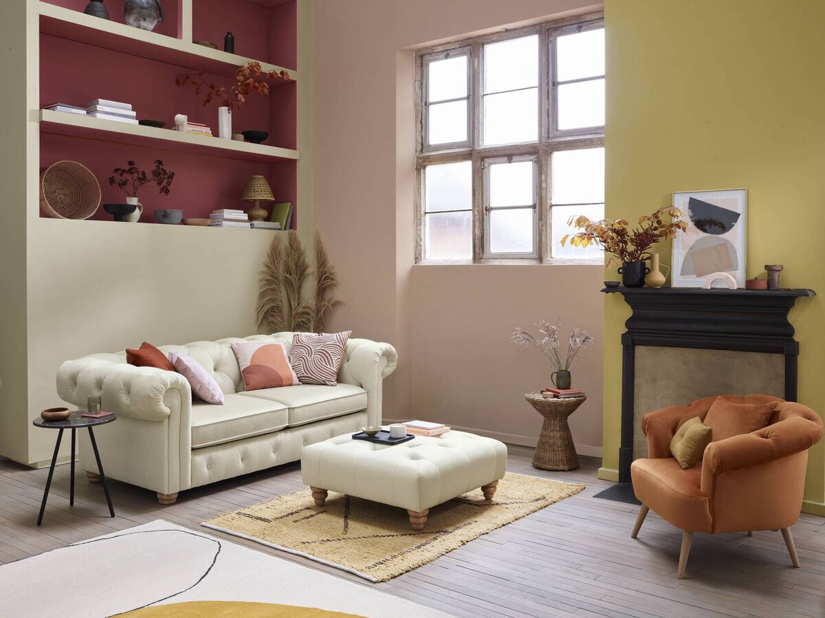 The DFS Belair velvet three-seater sofa bed, €1,449, and velvet square-top button footstool, €419, both pictured above, come in Dulux Colour of the Year 2023 Wild Wonder.