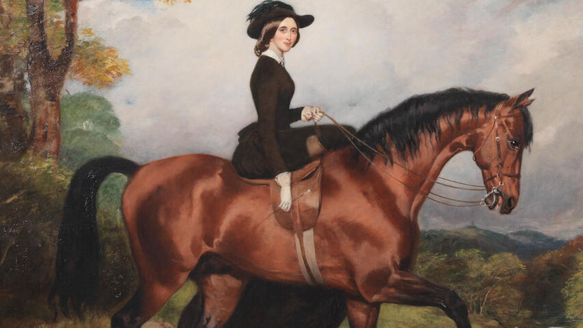 The portraits are each estimated at £20,000-£30,000 (€23,190-€34,790). Shown here is Sarah Conolly, mounted side saddle on a chestnut hunter in a landscape.