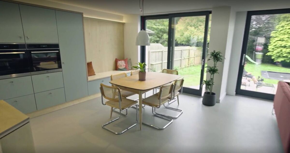 From here a full-length storage wall connects to the front to a new dining and living area overlooking the rear garden.
