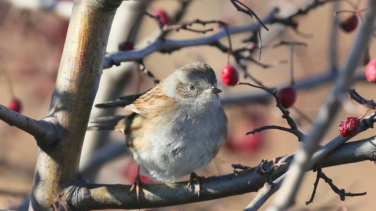 A dunnock (Prunella modularis) on a bush branch with red rose hips. Picture: iStock