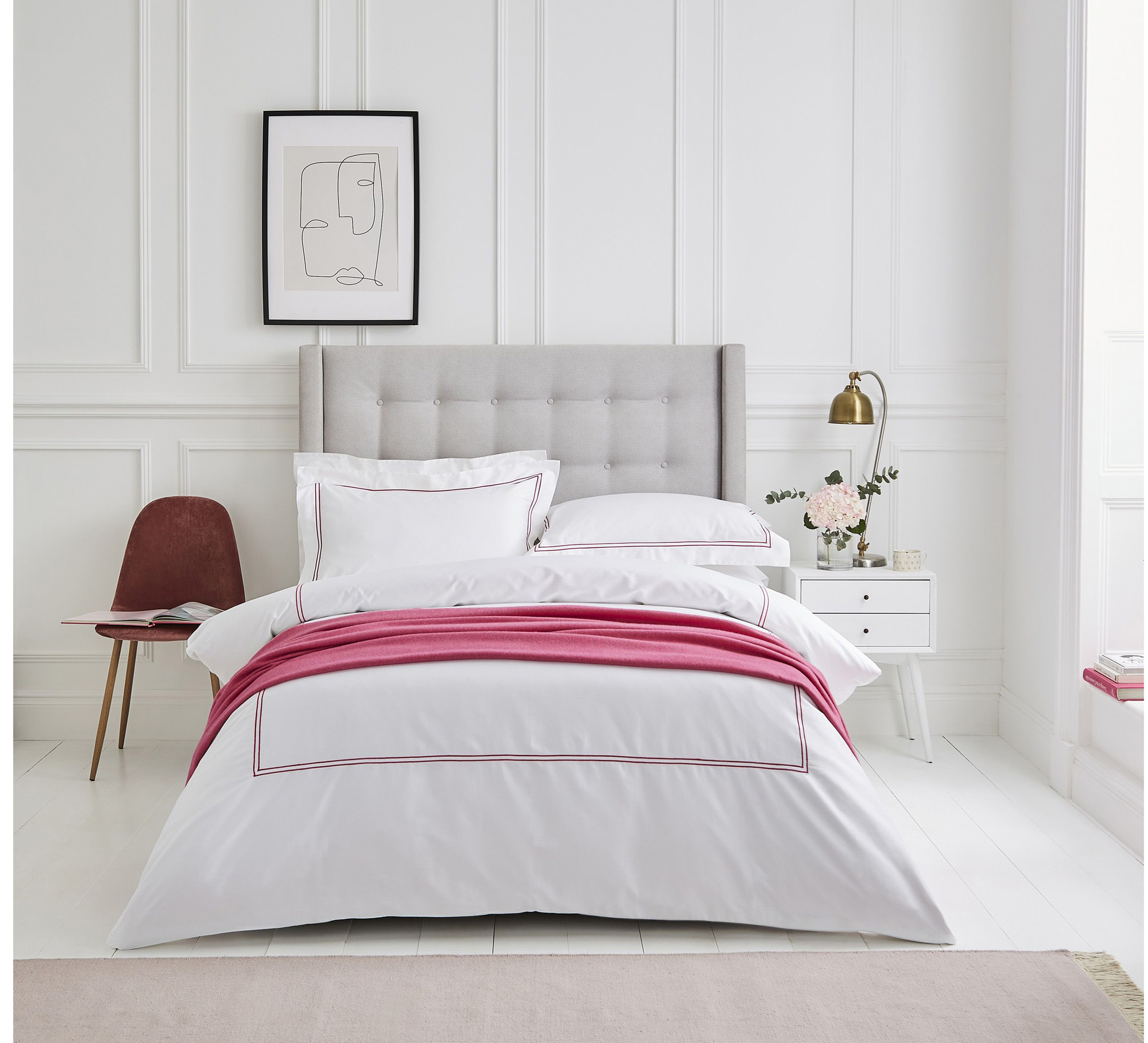 This luxe-look linen with satin stitch will give your bedroom the five-star treatment — and make it feel like a boutique hotel. Especially teamed with soothing shades and pops of lipstick-pink to bring it all together.
