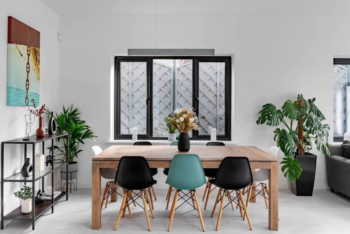 Annie and Paul describe the interior style as a mix of clean lines, neutral materials and pops of colour.