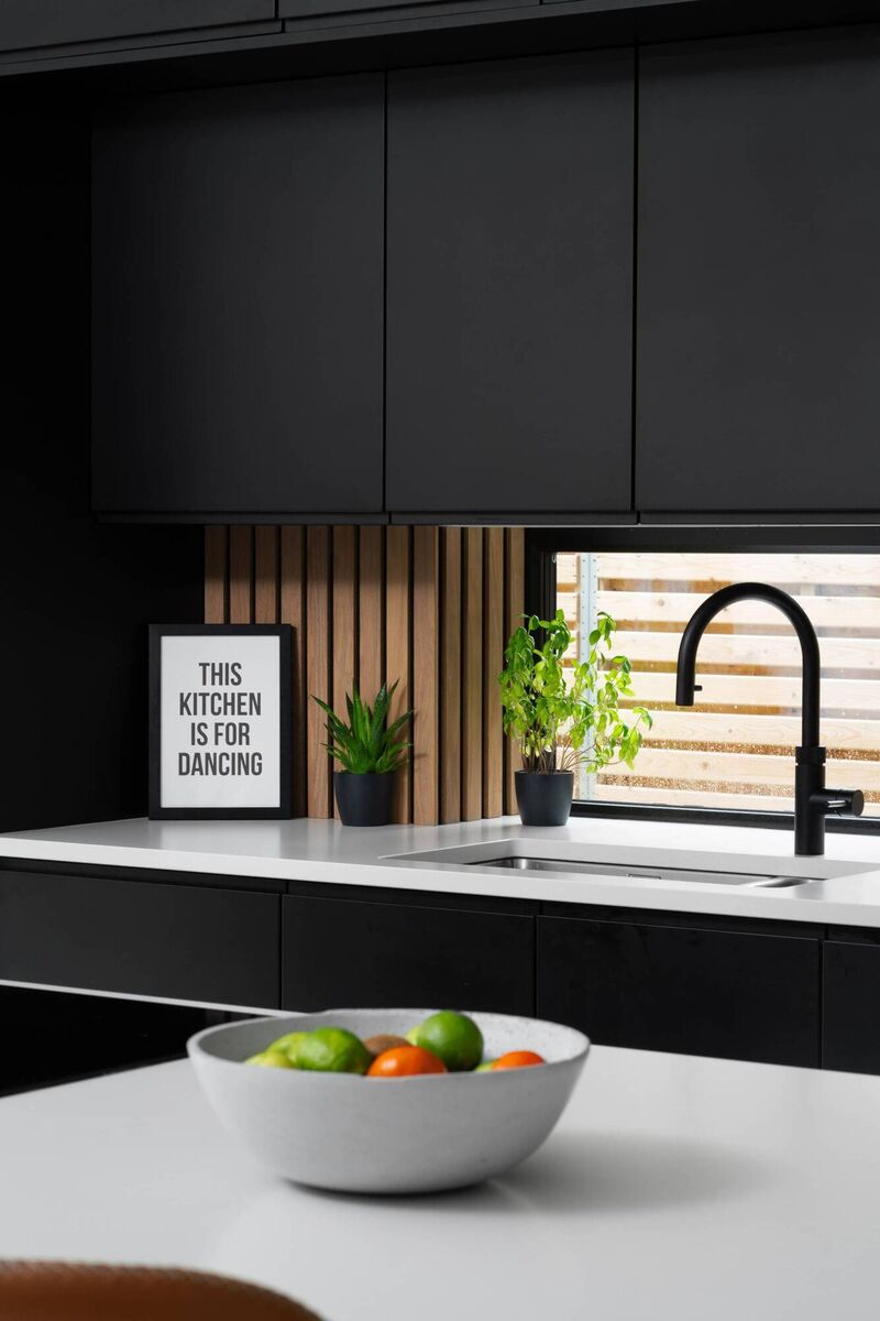 The upper floor is clad in black timber and the frame was built in Annie’s family workshop onsite.