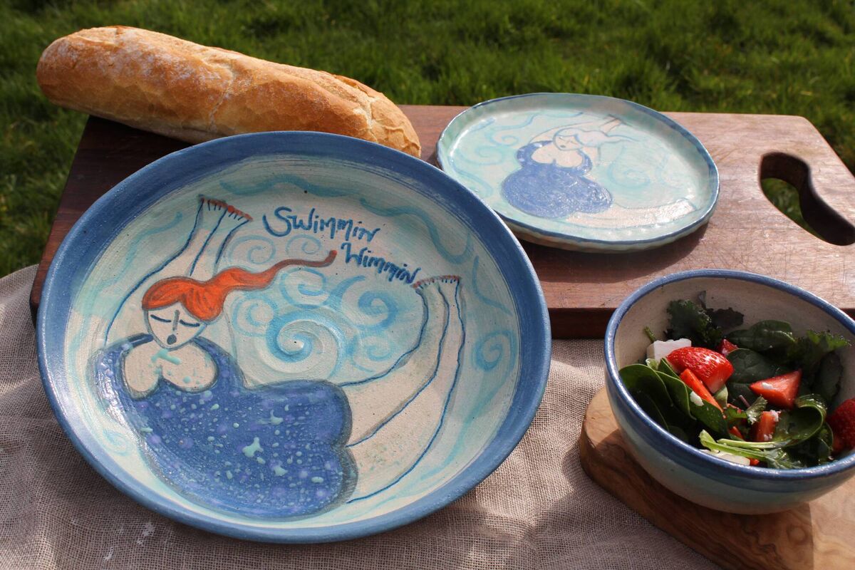 Hand-crafted by ceramic artist Julia Clarke in her workshop overlooking Ballinskelligs Bay, the Swimmin Wimmin platter is an inspiration to dive into the big blue.