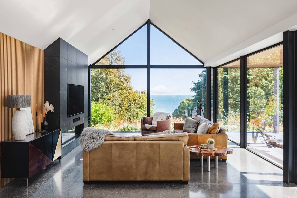 Rob and Janice McConnell's architectural new build, steeped in woodland, with sea views and a river running through the garden, was a popular choice as 2023.