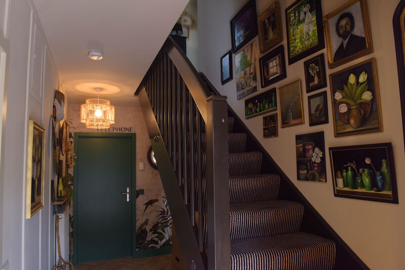 Hanging art above the stairs also draws the eye, much of it painted by Gavin.