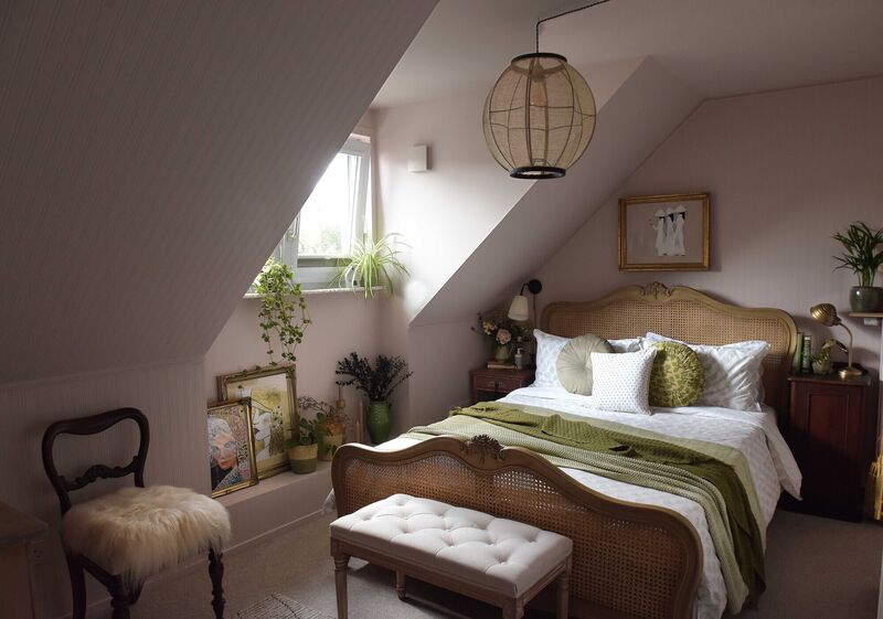 Upstairs two bedrooms are occupied by slumbering teenagers, but the main bedroom has a fetching vintage-style bedframe bought new, sitting with a freebie chest of drawers from Facebook Marketplace, accessorised with a charity shop mirror and a modern lamp.
