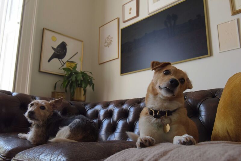Her grandmother’s hanging is framed in the hall. On the landing, a vignette of 12 gold frames tells a story in photography of family and friends, another example of proximity to loved ones.