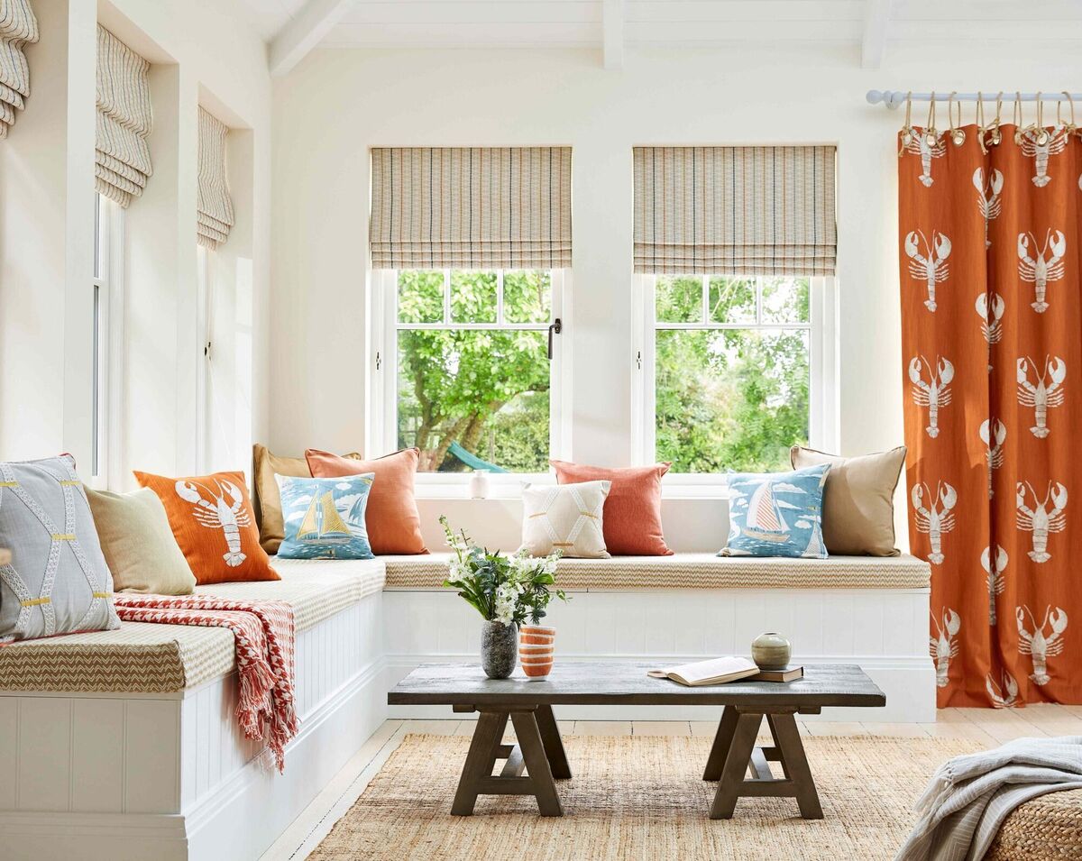 Tied up on string, French doors wear curtains while the windows of this coastal home carry traditional striped blinds. Quirky and cheerful, the Cromer Embroidery fabric from Sanderson Home was inspired by the annual Crab and Lobster Festival in Cromer, Norfolk. From €77 per metre, suppliers include thedraperyshop.ie (Cork).